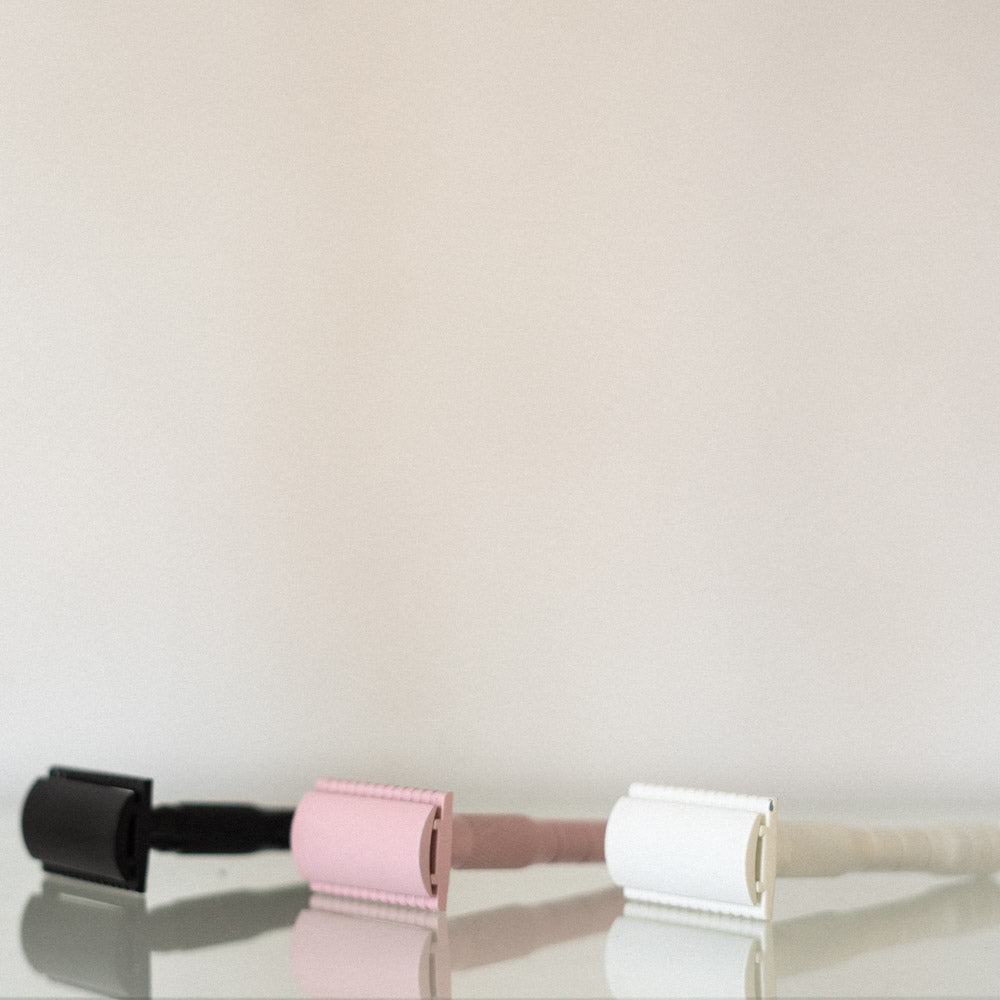 This razor might be intimidating at first, but once you make the switch we promise you won't regret it and here's why: superior shave with reduced irritation, sustainable, plastic free alternative and more cost effective in the long run This brass safety razor comes with one blade. Available in 3 colour options: white, pink or black.